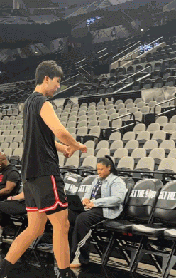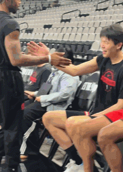 零点吧4月23日讯 昨日开拓者对阵马刺G2赛前,记者周玲安拍到杨瀚森和队友乐福积极互动,并与助教伯勒尔用英文流利沟通。伯勒尔是去年夏联时球队的主帅。