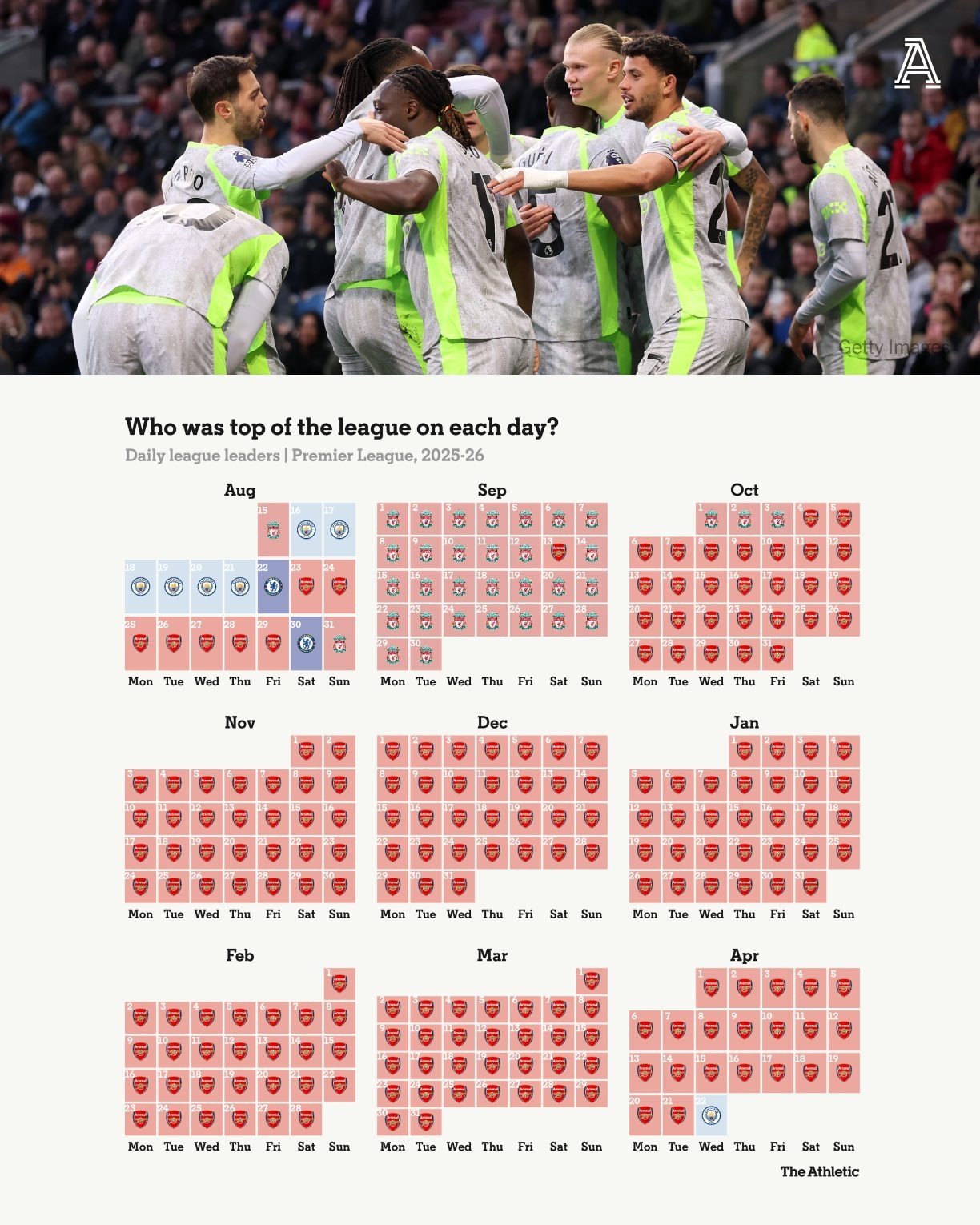 现在是曼城!本赛季每天的英超榜首:利物浦34天 阿森纳多达208天