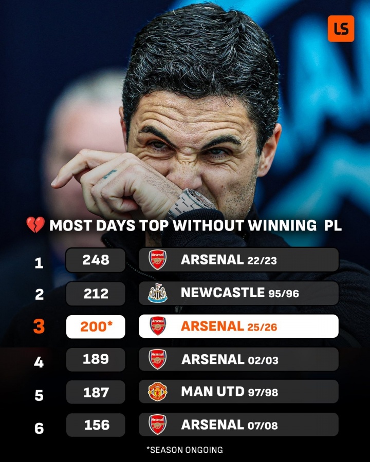 据LiveScore统计的数据,赛季领跑英超天数最多却未能最终夺冠,阿森纳此前已经有过3次这样的经历,他们曾在2022/23赛季领跑248天最终却没能拿到英超冠军。