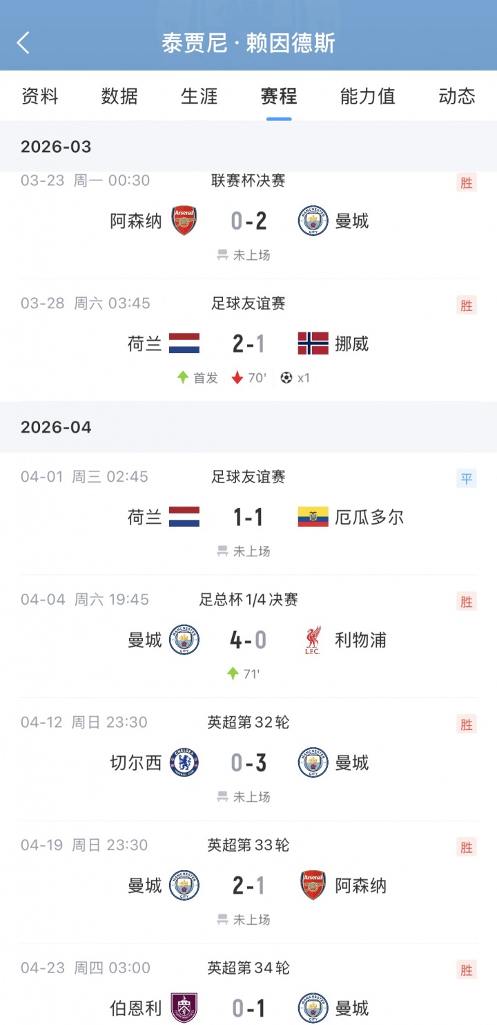 之后赖因德斯俱乐部赛事目前4场没出战,出场的一场为足总杯1/4决赛4-0击败利物浦,赖因德斯第71分钟替补登场。