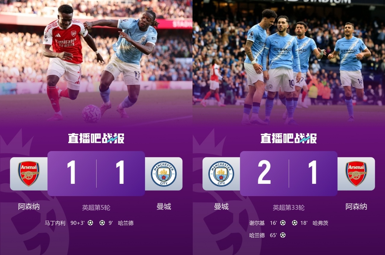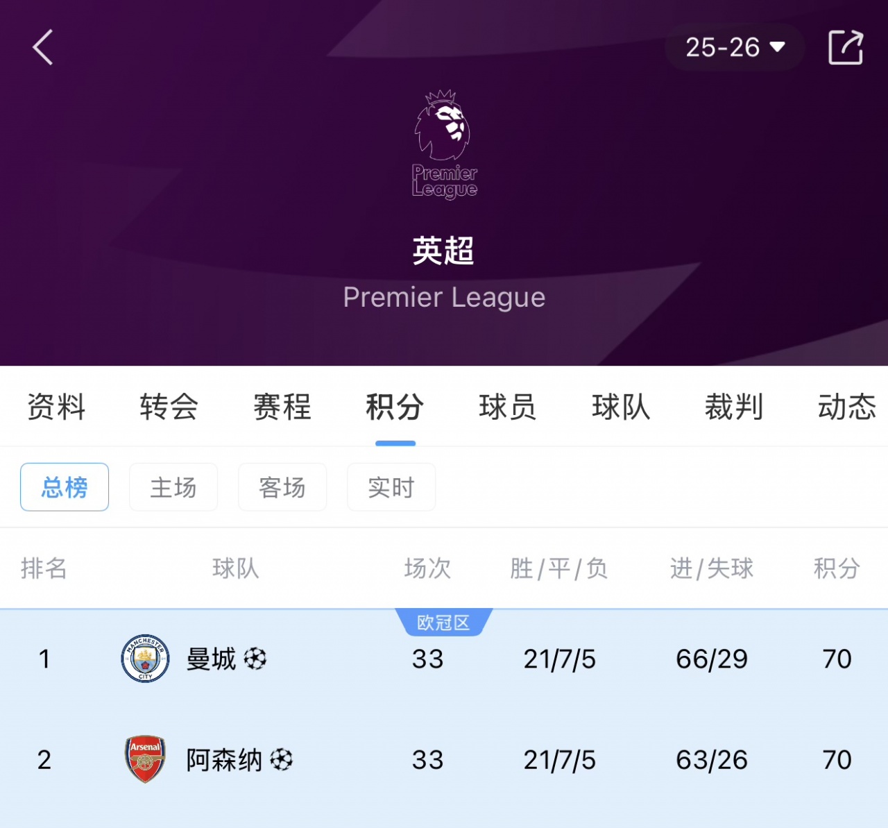 不存在附加赛可能!曼城枪手同分将比较净胜球、进球数、交手战绩