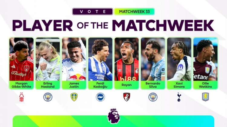 零点吧足球4月23日讯 今天,英超联赛在官网公布了2025/26赛季英超第33轮最佳球员候选,哈兰德、B席、沃特金斯等8位球员在列。