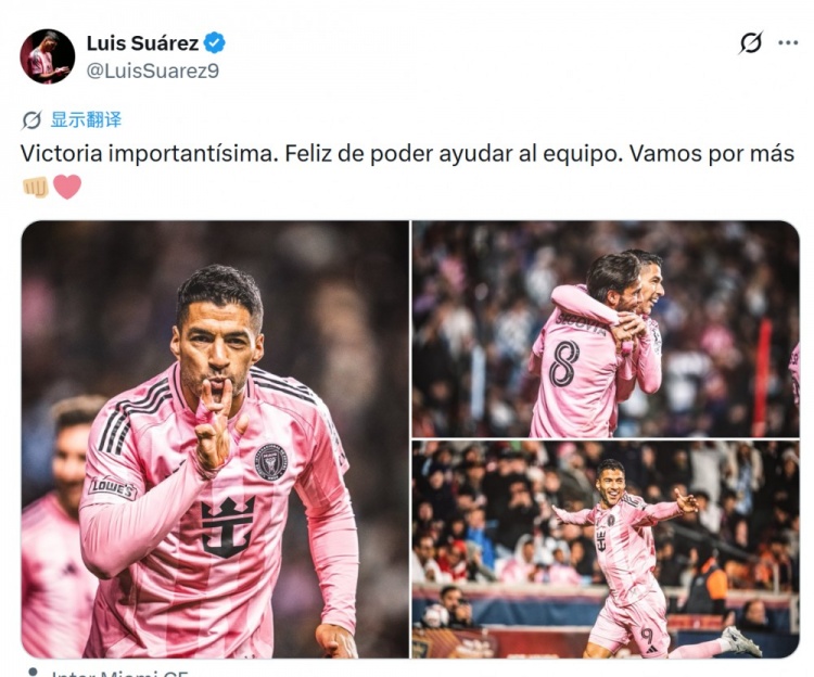 苏亚雷斯社媒晒出庆祝进球的照片,配文:“一场至关重要的胜利。很高兴能为球队提供帮助。继续前进,争取更多胜利。”