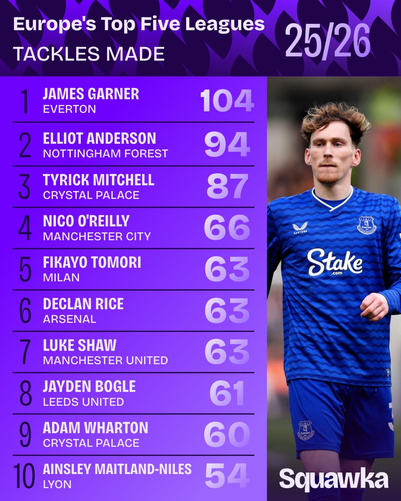 本赛季英格兰球员五大联赛铲球榜:加纳居首,奥赖利赖斯均在内