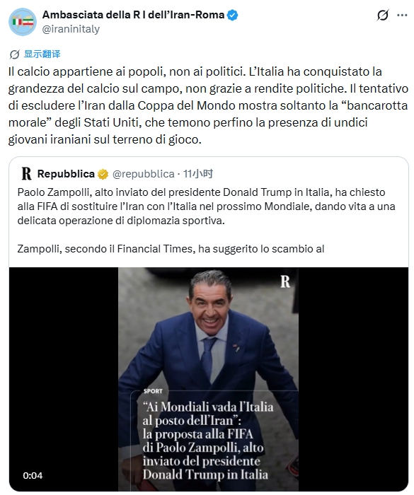 伊朗驻意大利罗马大使馆随即在社交媒体发文回应:“足球属于人民,而非政客。意大利的足球辉煌是在赛场上拼来的,绝非仰仗政治红利。企图剥夺伊朗的世界杯参赛资格,恰恰暴露了美国的‘道德破产’——他们甚至连十一名伊朗年轻球员现身赛场都心怀忌惮。”