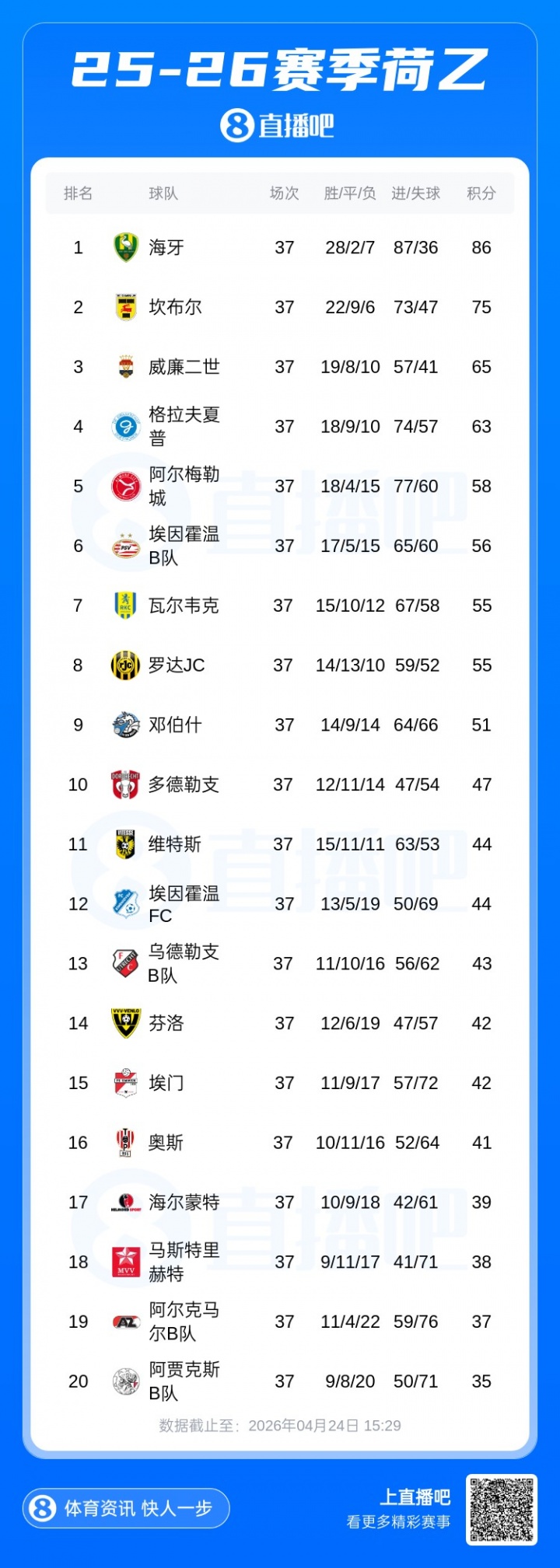 零点吧足球04月24日讯 目前荷乙仅剩最后一轮,据《队报》报道,目前排名第9的邓伯什末轮输球,反而能提升参加升级附加赛的机会,这一切都源于荷乙复杂的规则。