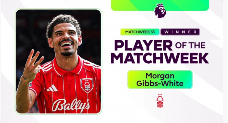 英超第33轮比赛,吉布斯-怀特打进3球,帮助诺丁汉森林4-1击败伯恩利,经过球迷的投票,他当选英超本轮最佳球员。