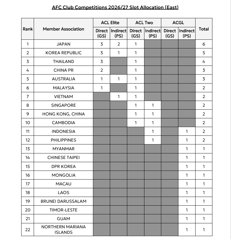 沙特球队和日本球队将拥有3个亚冠精英联赛正赛席位和2个亚冠精英联赛附加赛席位。