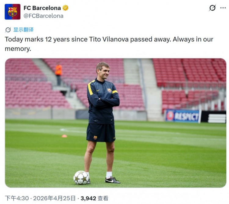 零点吧足球4月25日讯 今天是比拉诺瓦去世12周年纪念日,巴萨官方社媒悼念。