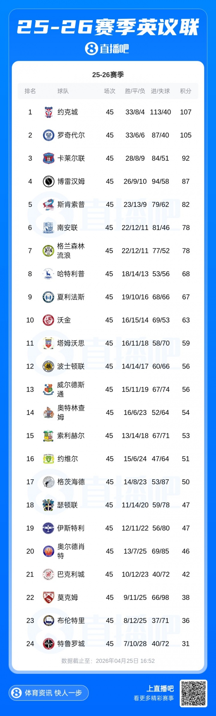 零点吧足球04月25日讯 北京时间今晚19点30分,英格兰全国联赛(第5级别)末轮同时开赛,前二球队约克城(107分)和罗奇代尔(105分)将直接交锋,只有一支球队能直通下赛季英乙,另一支球队将参加附加赛。赛前约克城和罗奇代尔发表联合声明,抗议这种不公。