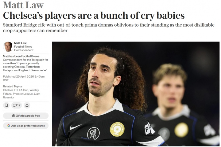 电讯报原文,标题为《切尔西球员都是一群爱哭鬼》↓