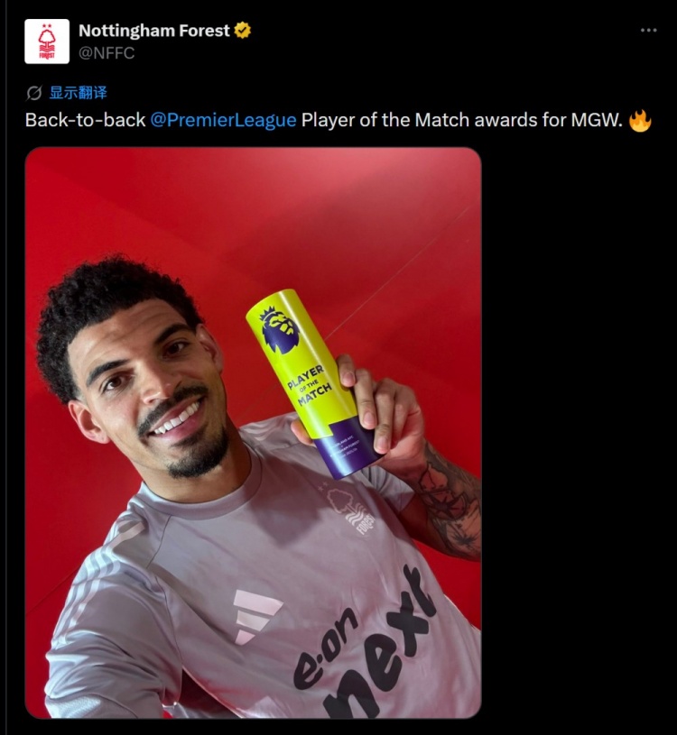 诺丁汉森林官方社媒晒出吉布斯-怀特与全场最佳奖杯的合照,对他表示祝贺。