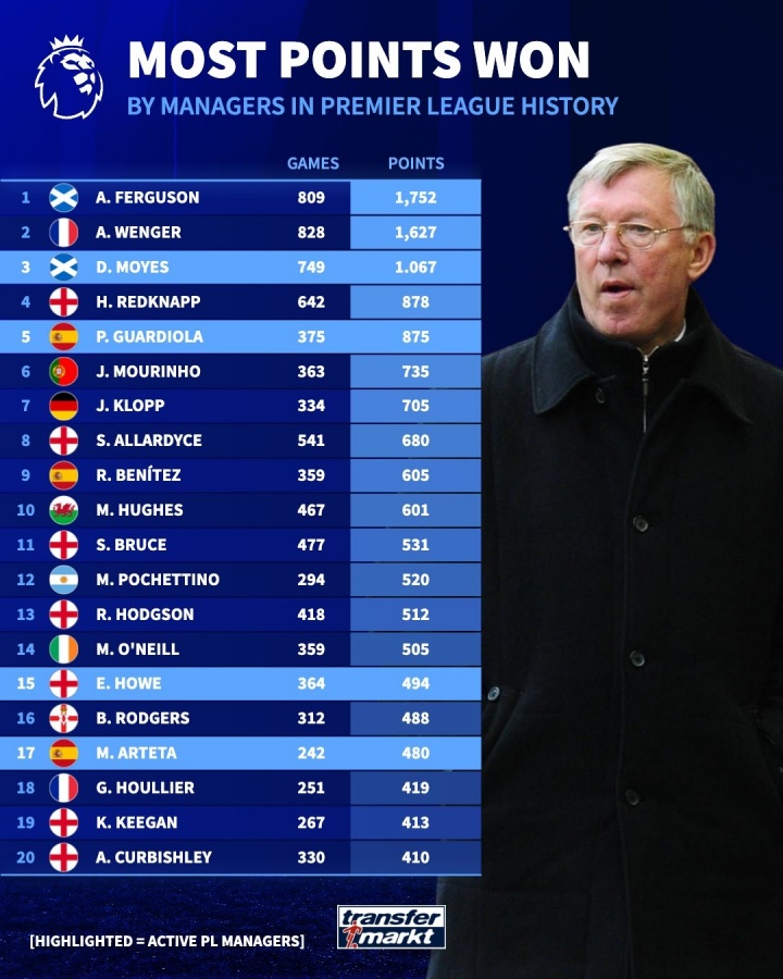 英超历史主帅得分榜: