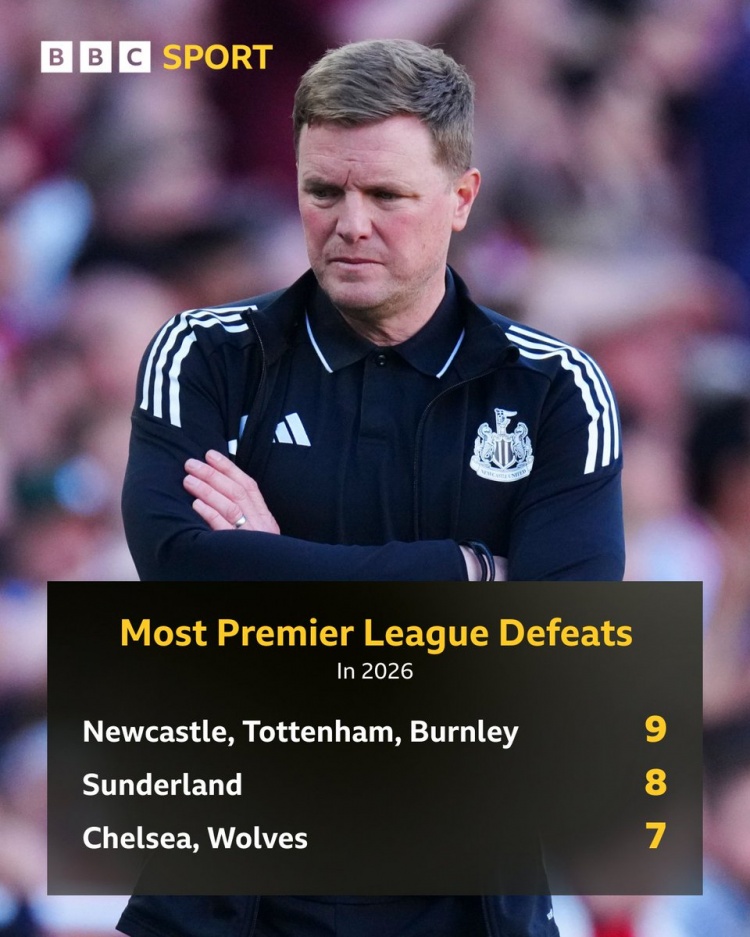零点吧足球4月26日讯 BBC列出2026年英超输球场次排名,纽卡、热刺、伯恩利输掉9场联赛最多。