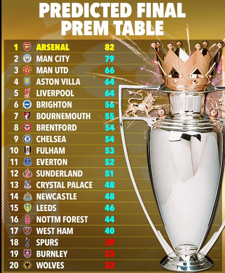 OPTA预测英超结局:阿森纳82分夺冠,曼城79分次席,热刺降级