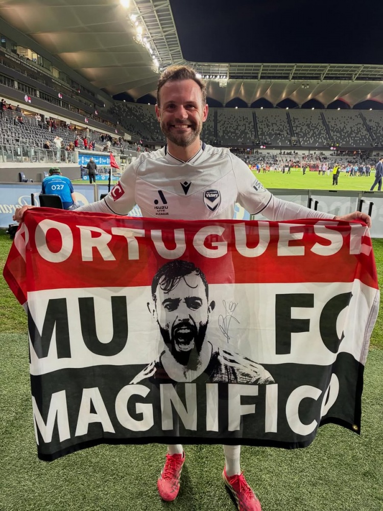 B费本赛季表现出色,有望竞争英超年度最佳球员奖项,马塔在球场上举起为B费加油的旗帜,上面写有“葡萄牙人、曼联、太出色了”字样,以及B费的头像。