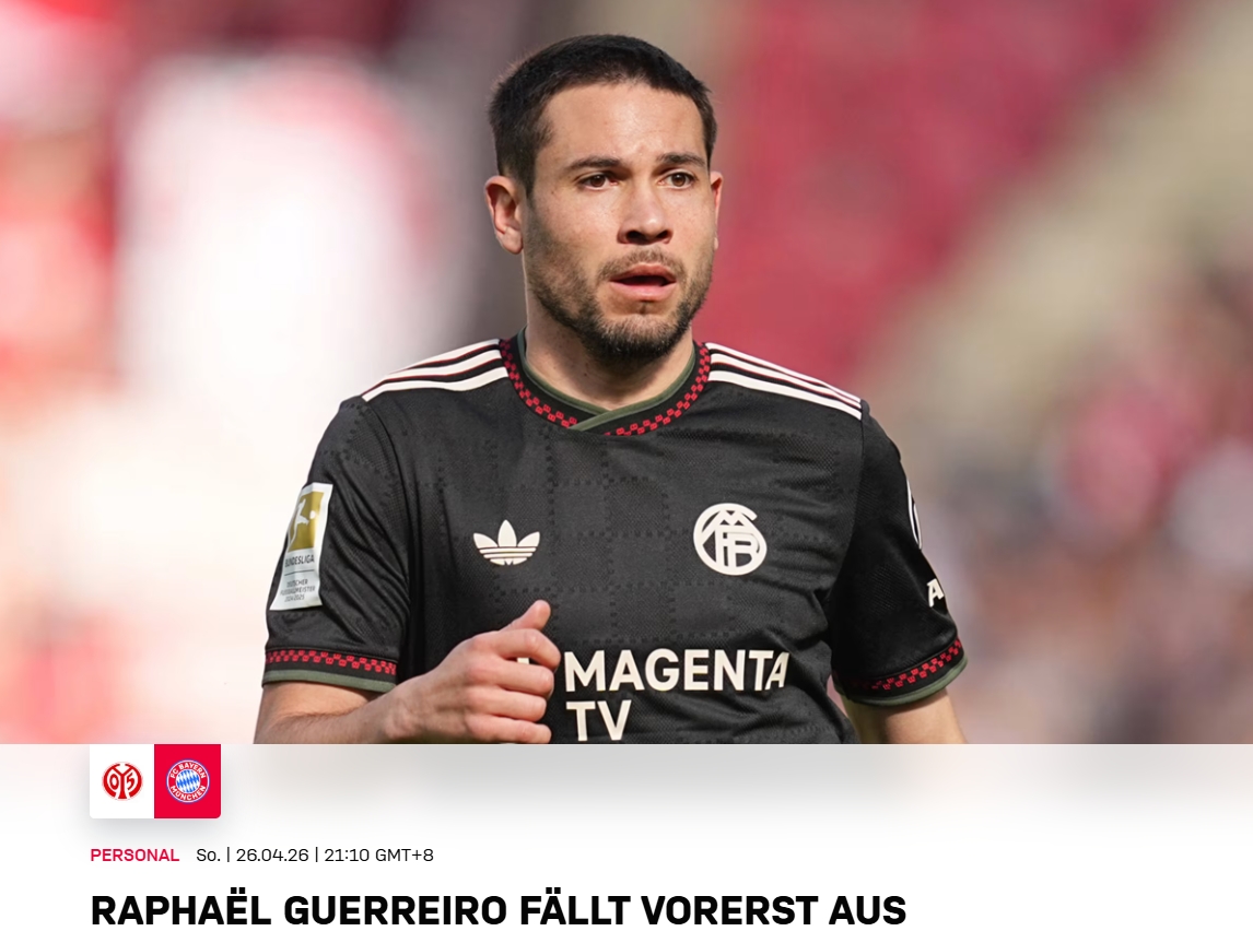 经拜仁慕尼黑医疗部门检查确认,拉斐尔·格雷罗在对阵美因茨的比赛中,左大腿后侧肌肉出现轻微撕裂。格雷罗将因此暂时缺阵。