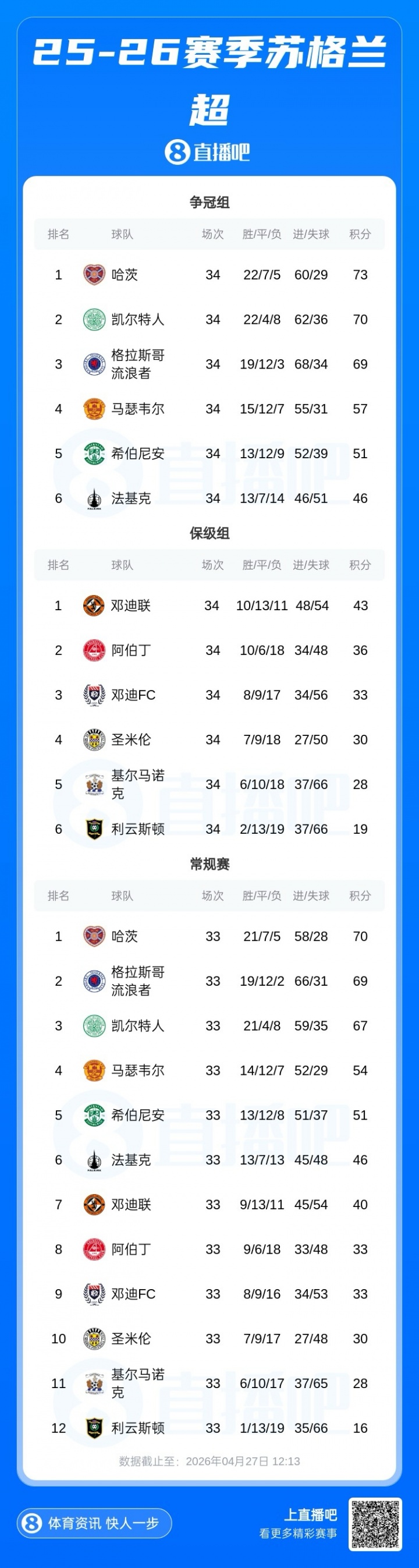 苏格兰超进入争冠阶段!哈茨领跑,力压两大豪门凯尔特人+流浪者