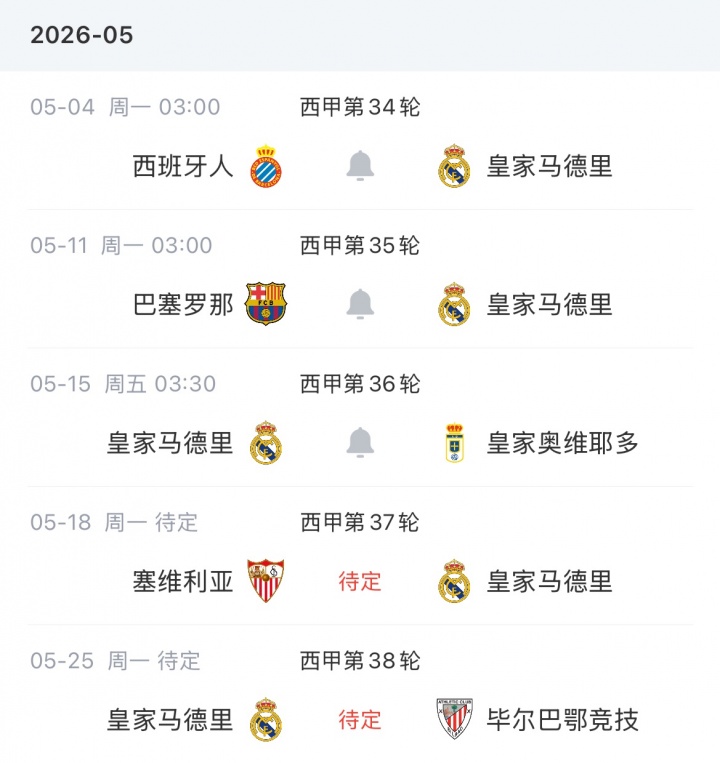皇马本赛季剩余赛程↓