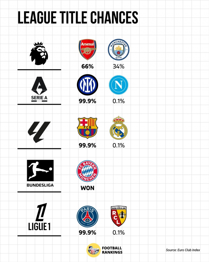 零点吧足球04月27日讯 欧洲五大联赛即将迎来五月份的冲刺收官阶段,Football Rankings引用Euro Club Index的数据,罗列出了五大联赛的最新夺冠概率。