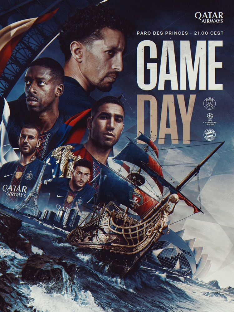 巴黎圣日耳曼官方社媒晒出了赛前海报,阿什拉夫、克瓦拉茨赫利亚、登贝莱、马尔基尼奥斯、卢卡斯出镜。