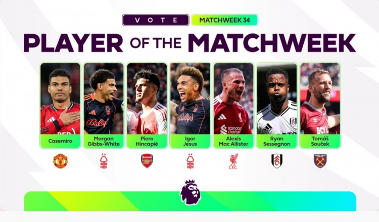 英超第34轮最佳球员候选:卡塞米罗、因卡皮耶、麦卡利斯特在列