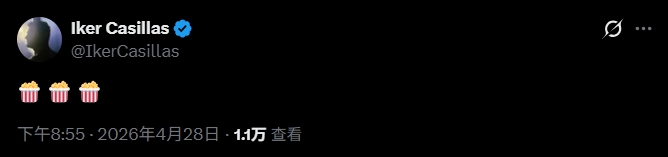 这一消息曝出后,迅速引起了足坛关注,皇马名宿卡西利亚斯也加入了吃瓜行列。在穆帅可能重返皇马的新闻发布一小时后,卡西在社媒发布了三个爆米花的emoji表情。