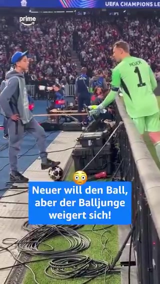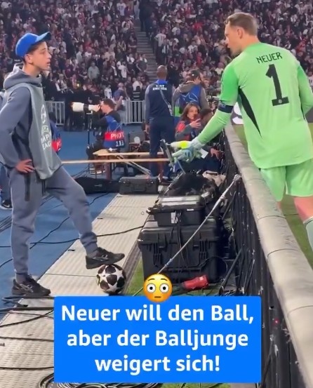 而在巴黎的一次反击出了底线之后,拜仁门将诺伊尔向身后的球童索要足球,但对方踩着足球不予理会,诺伊尔也只能无奈转身寻找其他足球。