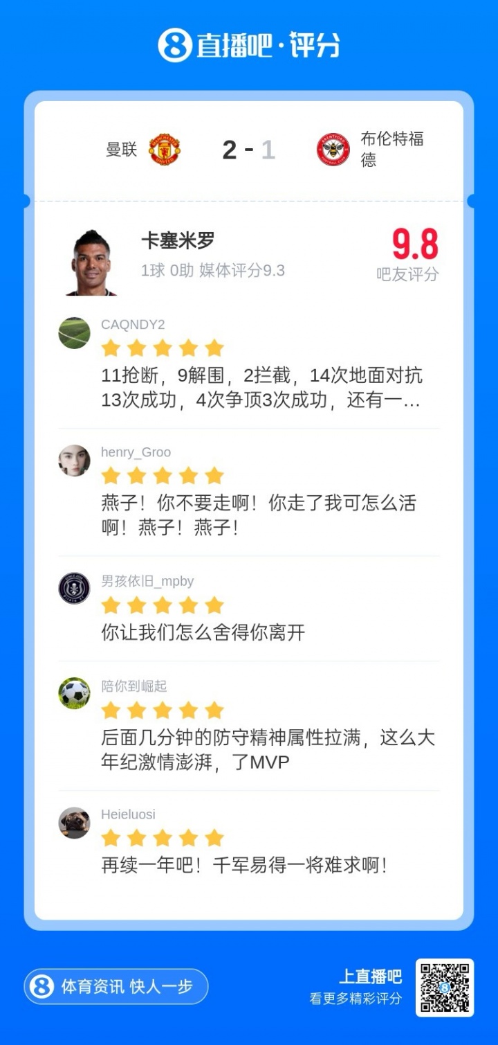 直播吧X咪咕体育|英超第34轮MVP:卡塞米罗!1球11抢断战神表现