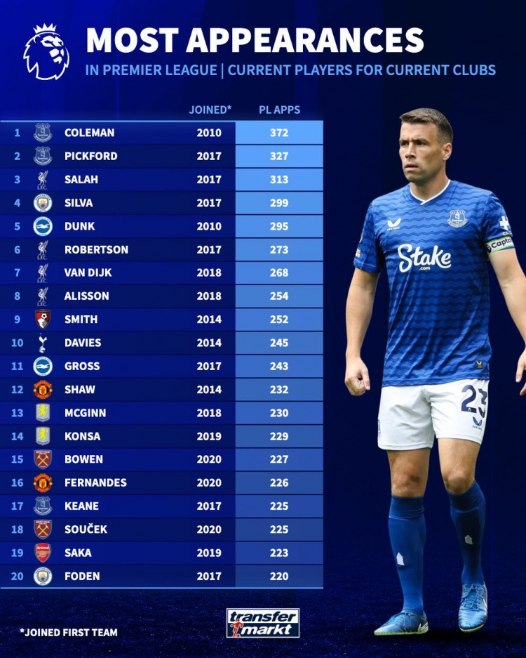 现役球员当前俱乐部英超出场榜:科尔曼、皮克福德、萨拉赫前三