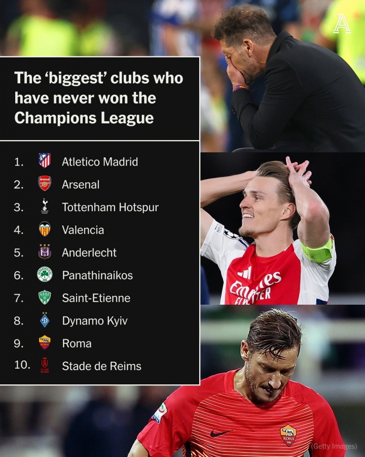 赛前The Athletic评出了从未夺得欧冠的球队排行榜,3次夺得欧冠亚军的马竞和一次夺得亚军的阿森纳分别占据前二。