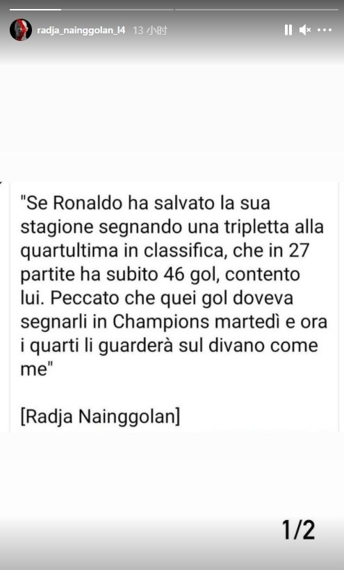 不过此后一些人认为纳因戈兰的这条动态是对C罗的不够尊重,并有人添油加醋。纳因戈兰进行了回应,他写道:“我们从哪儿开始说呢?现在人们开始对我口诛笔伐,就好像我真的发表了什么声明。我表达了我对为卡利亚里效力的喜悦之情,我们打进了一些进球,而且对目前在积分榜上所处的位置感到满意,所以拜托,别再说这些了。至于C罗,对于像他这样的冠军球员,我只有尊重。所以够了,不要再提我的名字了,还有你们说的那句话真的是从我口中说出来的吗?”