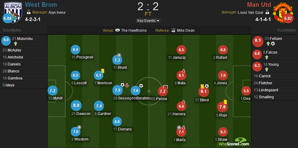 易边再战,曼联用费莱尼换下埃雷拉。第48分钟,曼联扳平比分!迪马利亚左路传中,费莱尼禁区内胸部停球转身晃开防守后起脚爆射,皮球应声入网!西布朗1-1曼联!第57分钟,贾努扎伊和拉斐尔在右路打出撞墙配合,拉斐尔禁区内底线附近横传,对方后卫先出一脚将球解围出底线,角球开出,迈希尔将球稳稳得到。第65分钟,西布朗再次领先!布伦特中场送出直塞球,贝拉希诺反越位成功单刀球面对德赫亚轻松推射得手!西布朗2-1曼联!
